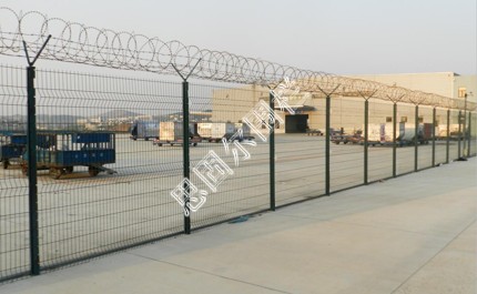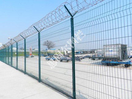 :如果在飛機場圍欄頂部加裝刀片刺絲、刀片刺繩后又很好的增強了安全防護性能。采用電鍍、熱鍍、噴塑、浸塑等防腐形式,具有很好的抗老化、抗曬、耐候等特點。其產品造型美觀、花色多樣,既起到圍欄作用,又起到美化作用。由于具有安全性高、防攀爬能力好,網片連接方式采用特制SBS緊扣件,有效防止人為的破壞性拆卸,橫向四道折彎加強筋,使網面強度顯著增加。